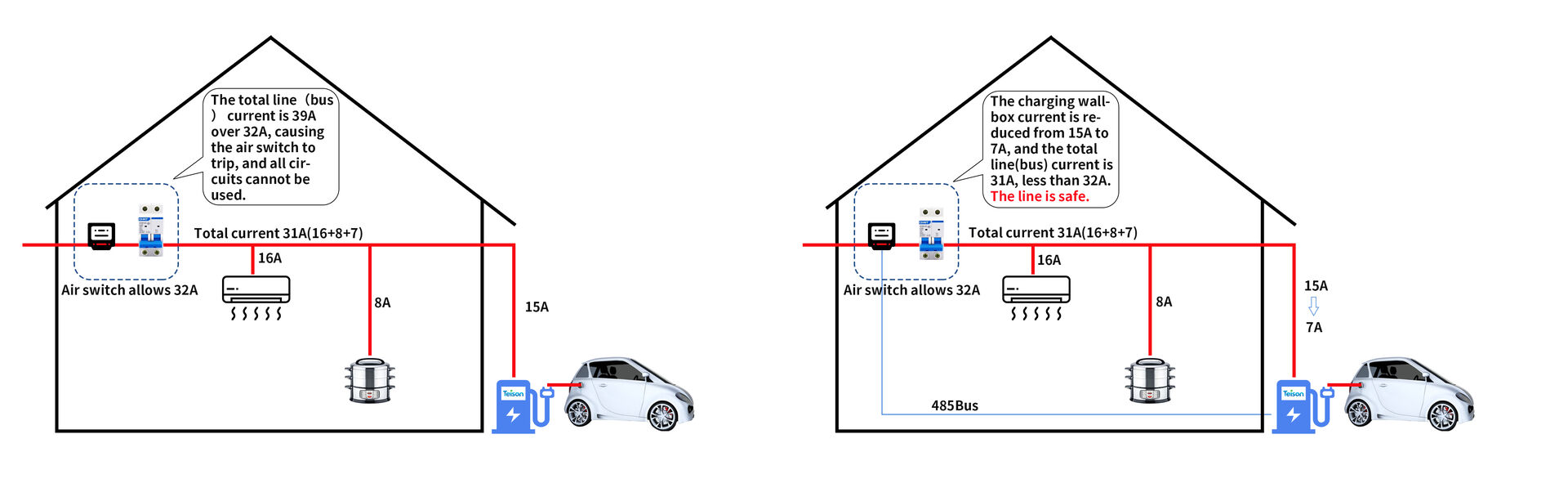 Grâce au protocole MODBUS, la wallbox TEISON peut surveiller la charge en temps réel du réseau domestique et, tout en garantissant que chaque appareil ménager peut fonctionner normalement, elle peut atteindre en toute sécurité la vitesse de charge la plus rapide et peut ajuster automatiquement la puissance de charge en fonction de la charge.